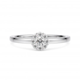Bague de Fiançailles sertie de 9 Diamants en forme de fleur. Ce modèle existe en Or 375/1000 9K uniquement en G/SI2 et en Or 750/1000 18K en qualilté G/SI2, G/SI1 et G/VS en couleur Jaune, Blanc ou Rose.