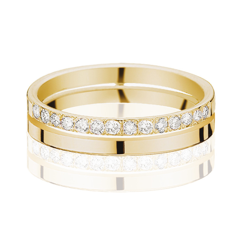 Alliance ruban en Or poli avec en son centre un ajourage fin. Une ligne de diamants est serti sur un côté de la bague lui donnant par son asymétrie un aspect très moderne. Ce modèle vous est proposé en Or 750/1000 (18K) en Jaune, Rose et en Blanc version classique ou Orlanium®. Vous trouverez lOr Blanc classique sur notre site cependant, l' Orlanium® est disponible exclusivement en boutique. Elle est également disponible en Or 375/1000 (9K) en Jaune, Rose et en Blanc version classique.