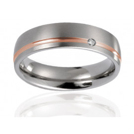 Alliance légèrement arrondie mate, d'inspiration moderne en Titane et en Or. Sa base ruban en Titane est traversée vers le bord par une bande en Or 750/1000 serti d'un Diamant.