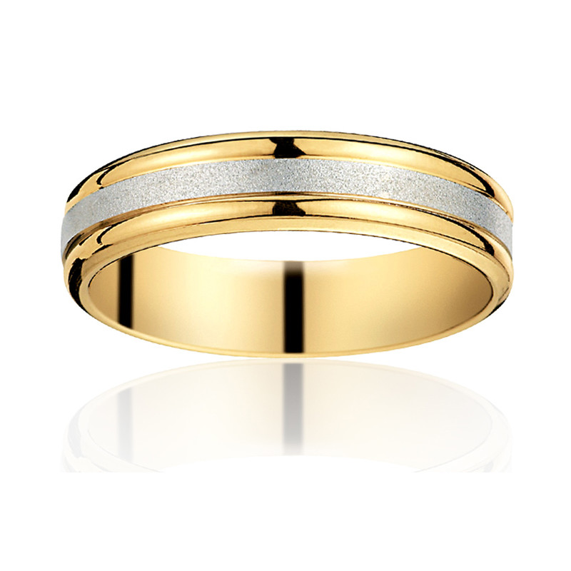 Alliance dont la base brillante aux rebords bombés est réhaussée par un centre sablé plat. Ce modèle est disponible en Or 750/1000 (18K) en version deux Ors : base Jaune/centre Rose ou base Jaune/centre Blanc, ainsi qu'en version tout Or Blanc, en Or classique ou Orlanium®.