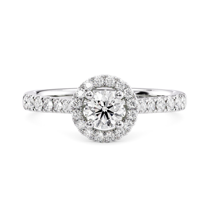 Solitaire accompagné de Diamant sur les côtés avec un Diamant centrale sertie d'un entourage diamants. Ce modèle existe en Or 375/1000 9K uniquement en G/SI2 et en Or 750/1000 18K en qualilté G/SI2, G/SI1 et G/VS en couleur Jaune, Blanc ou Rose. En Platine 950/1000 en qualilté G/SI1 et G/VS.