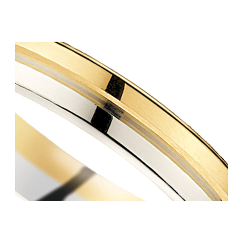 Alliance plate bicolore, avec une partie en Or Blanc et une autre en Or Jaune, séparées de manière hamonieuse par un liseré central. Cette alliance bicolore en en Or 750/1000 (18K) couleur : Jaune et en Blanc version classique ou en Orlanium® disponible exclusivement en boutique et peut aussi se réaliser en Or 375/1000 (9K).